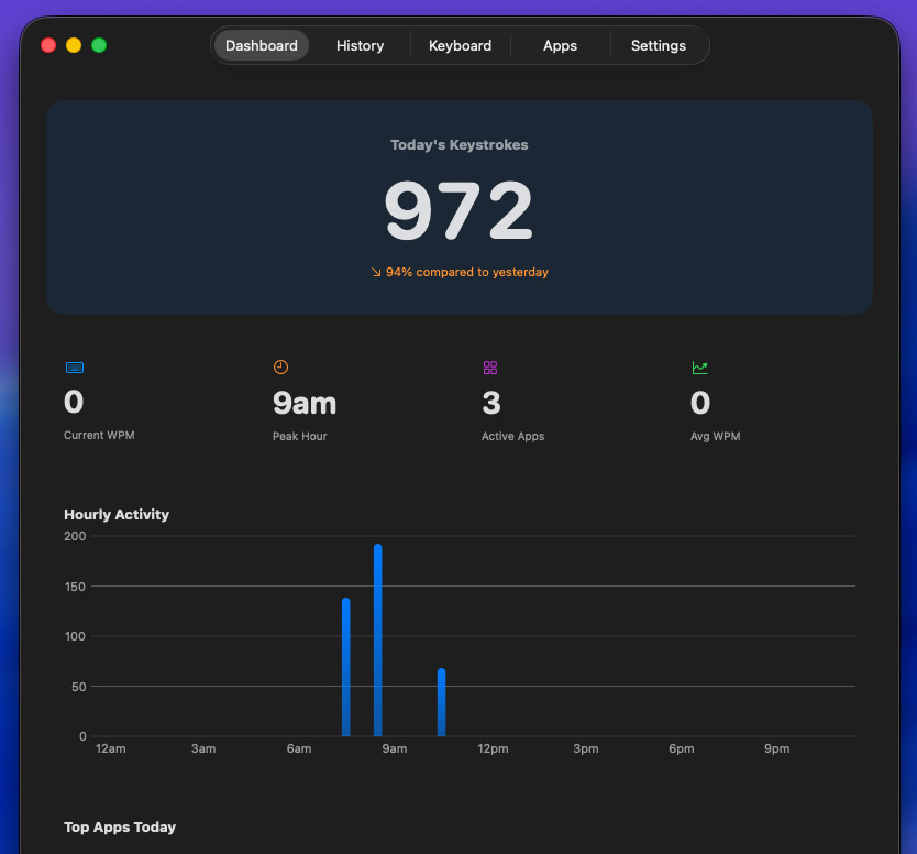 A beautifully crafted macOS menu bar app that tracks your keystrokes, typing behavior, and productivity patterns β all securely on your device.'