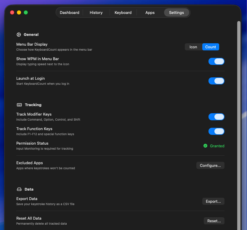 Unlike free tools, KeyboardCount is designed specifically for macOS, offers deeper analytics, includes per-app insights, and maintains full local privacy. No subscriptions, no advertising, and no hidden data collection.