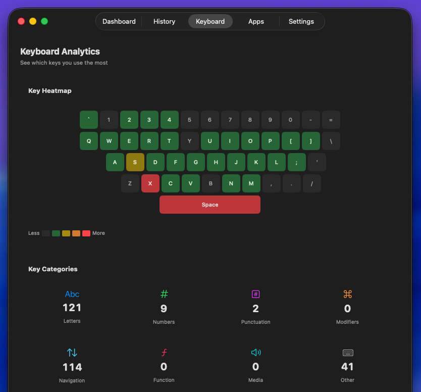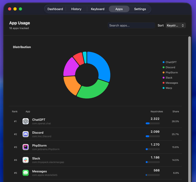 Discover where you type the most β email apps, IDEs, writing tools, browsers, or games.